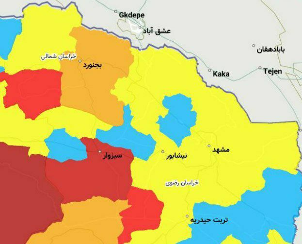 بر این اساس در حال حاضر از بین ۳۳ شهرستان خراسان رضوی چهار شهرستان در وضعیت قرمز، یک شهرستان در وضعیت نارنجی، ۲۰ شهرستان در وضعیت زرد و هشت شهرستان در وضعیت آبی قرار دارند.