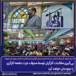 مدیرکل تعاون، کار و رفاه اجتماعی استان اصفهان در جمع دو هزار نفری کارگران و استادکاران ساختمانی شهرستان شهرضا اظهار داشت: پیگیری مطالبات کارگران توسط صنوف، عزت جامعه کارگری را دوچندان خواهد کرد. میثم مداحی در این جلسه با اشاره به فصل ششم قانون کار گفت: کلیه انجمنهای صنفی و کانونهای کارگری پس از تشکیل، با مراجعه به وزارت تعاون، کار و رفاه اجتماعی و طی مراحل قانونی عملاً دارای شناسنامه و هویت میشوند.