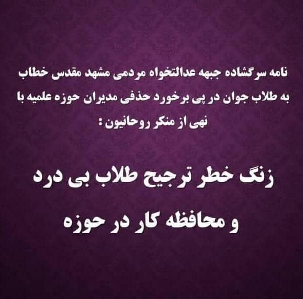 نامه سرگشاده جبهه عدالتخواه مردمی مشهد خطاب به طلاب جوان در پی برخورد حذفی مدیران حوزه علمیه با نهی از منکر روحانیون