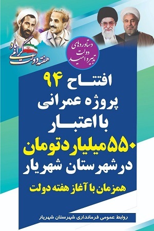 در سومین و چهارمین روز از هفته دولت، مهندس طاهری فرماندار شهرستان شهریار و دیگر مسئولین شهری و شهرستانی ضمن حضور در حرم مطهر بنیان گذار کبیر انقلاب اسلامی و تجدید پیمان با آرمان های امام راحل(ره)، پروژه های صنعتی شهر فردوسیه و پروژه های عمرانی شاهدشهر اعم از کمر بندی انقلاب، اورژانس 115، ساختمان NA، گلخانه علی آباد و شرکت ماشین آلات صنعتی نوین فولاد در این شهر افتتاح را افتتاح خواهند کرد.