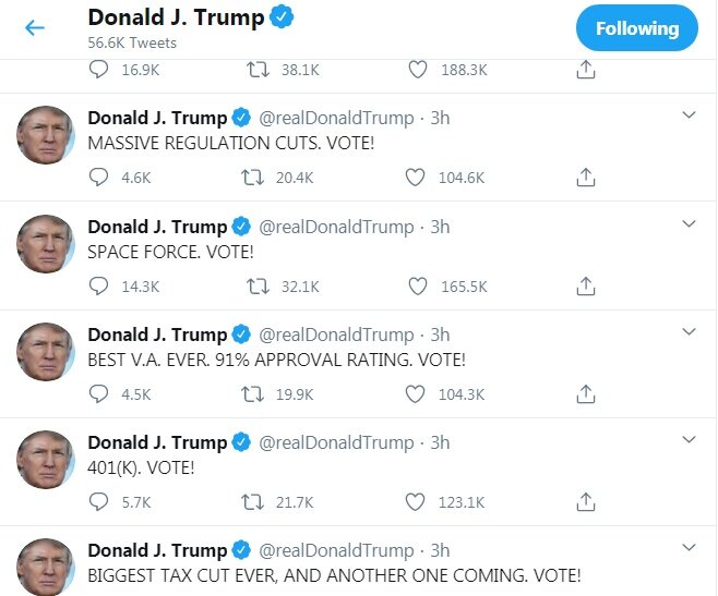 «نظم و عدالت. رأی بدهید!»، «قویترین ارتش. رأی بدهید!» و یا «بزرگترین کاهش مالیاتی. رأی بدهید» از مضمون شماری از این توییتها هستند.